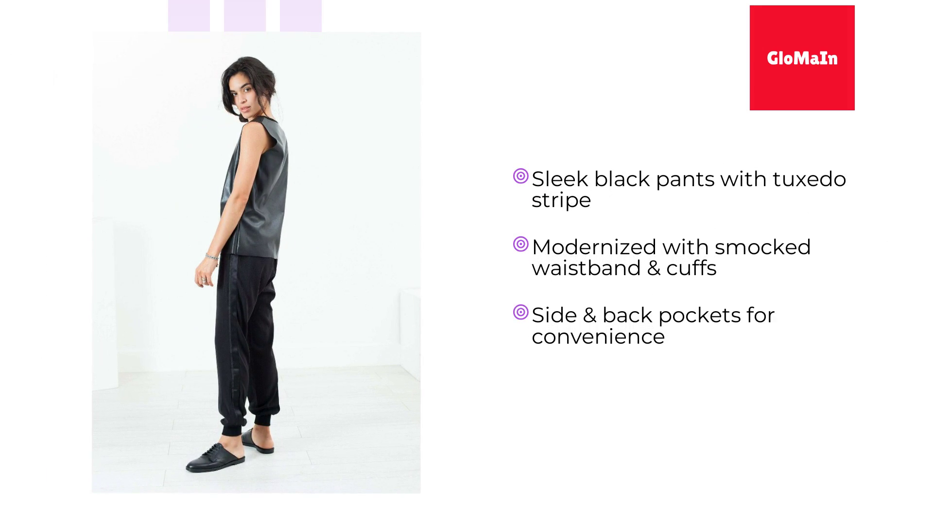 Sleek tapered pants with a tuxedo stripe and modernized with a smocked elastic waistband and ribbed-knit banding to cinch the cuffs. Side welt pockets and double welt pockets at the back. Color Black. 90% Shell Polyester, Exterior 96% Polyester. Ashley is wearing a German 34.