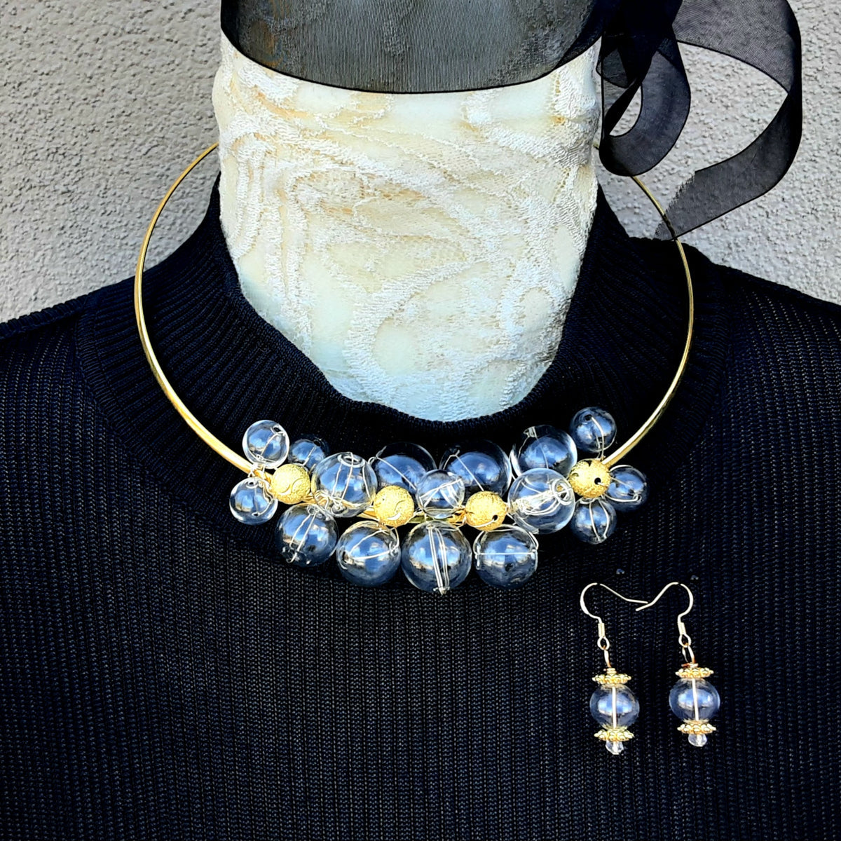 This Glass Bubble Chunky Choker measures 20"s in length and comes on a gold plated brass wire.