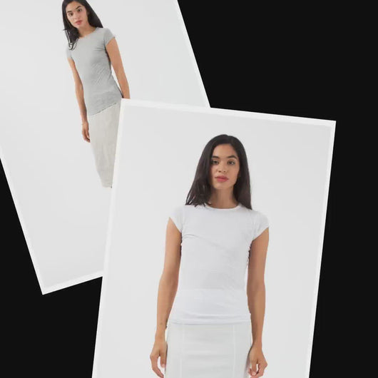 The Fitted Tee from Organic by John Patrick is your perfect summer go-to. This slim fitting piece is lightweight and durable. Capped Sleeves. Crew neckline. 100% Organic Cotton. Made in Peru. Ashley is wearing an X-Small.
